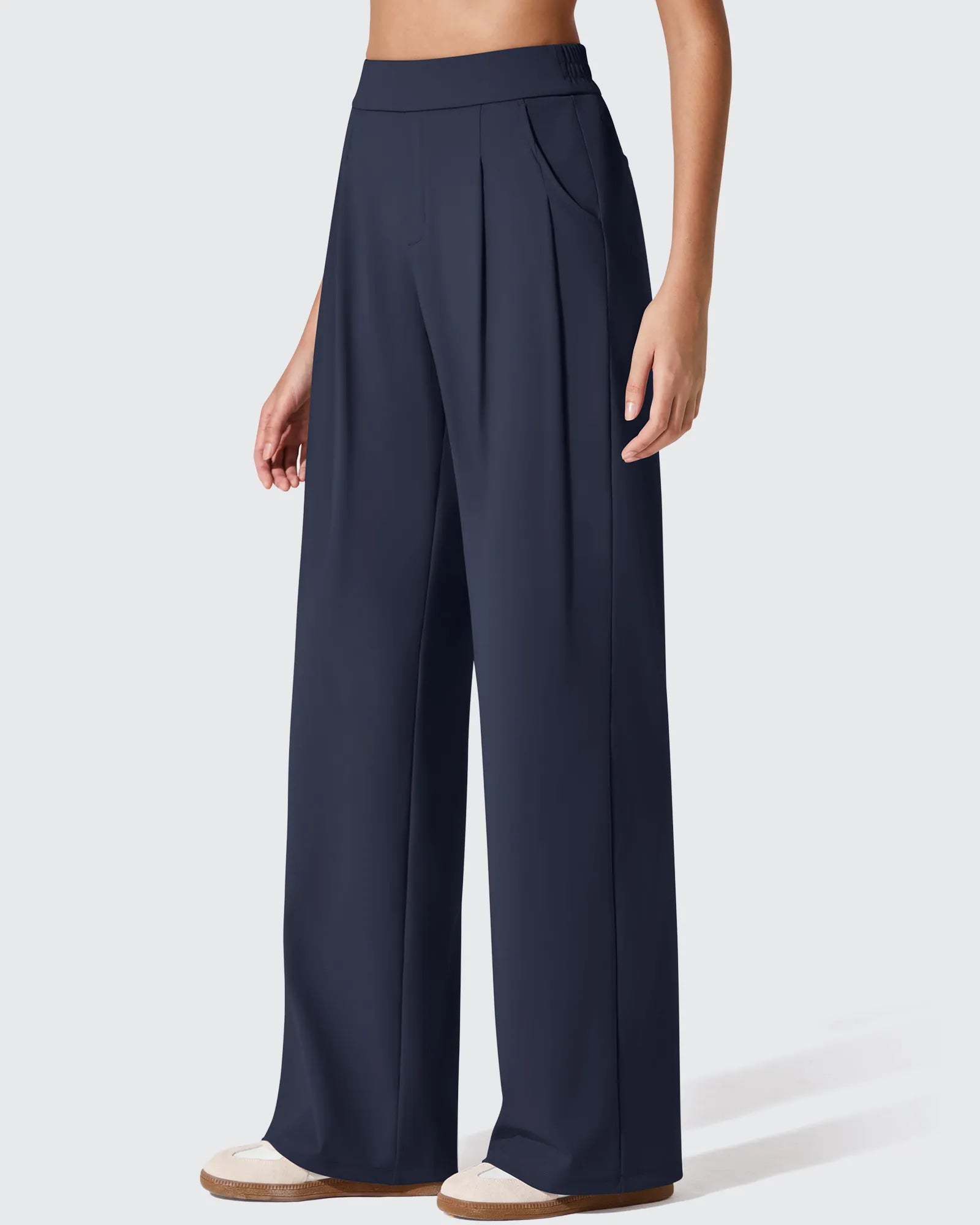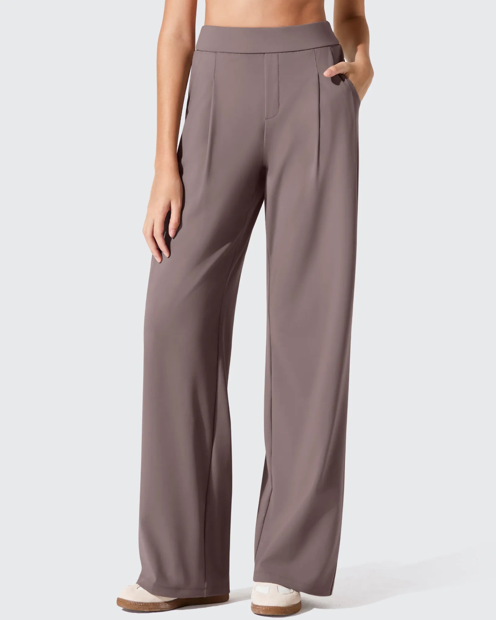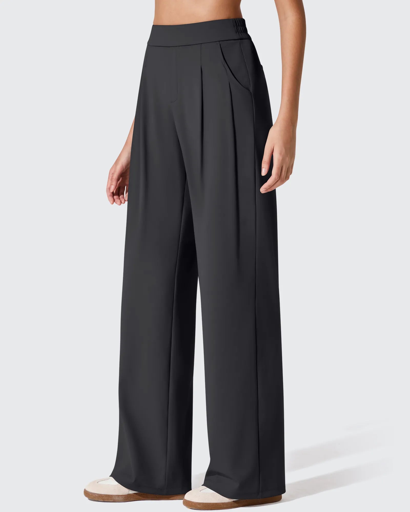 4-way stretch fabric delivers wrinkle-resistant drape, high-waisted slim-fit design flatters curves.